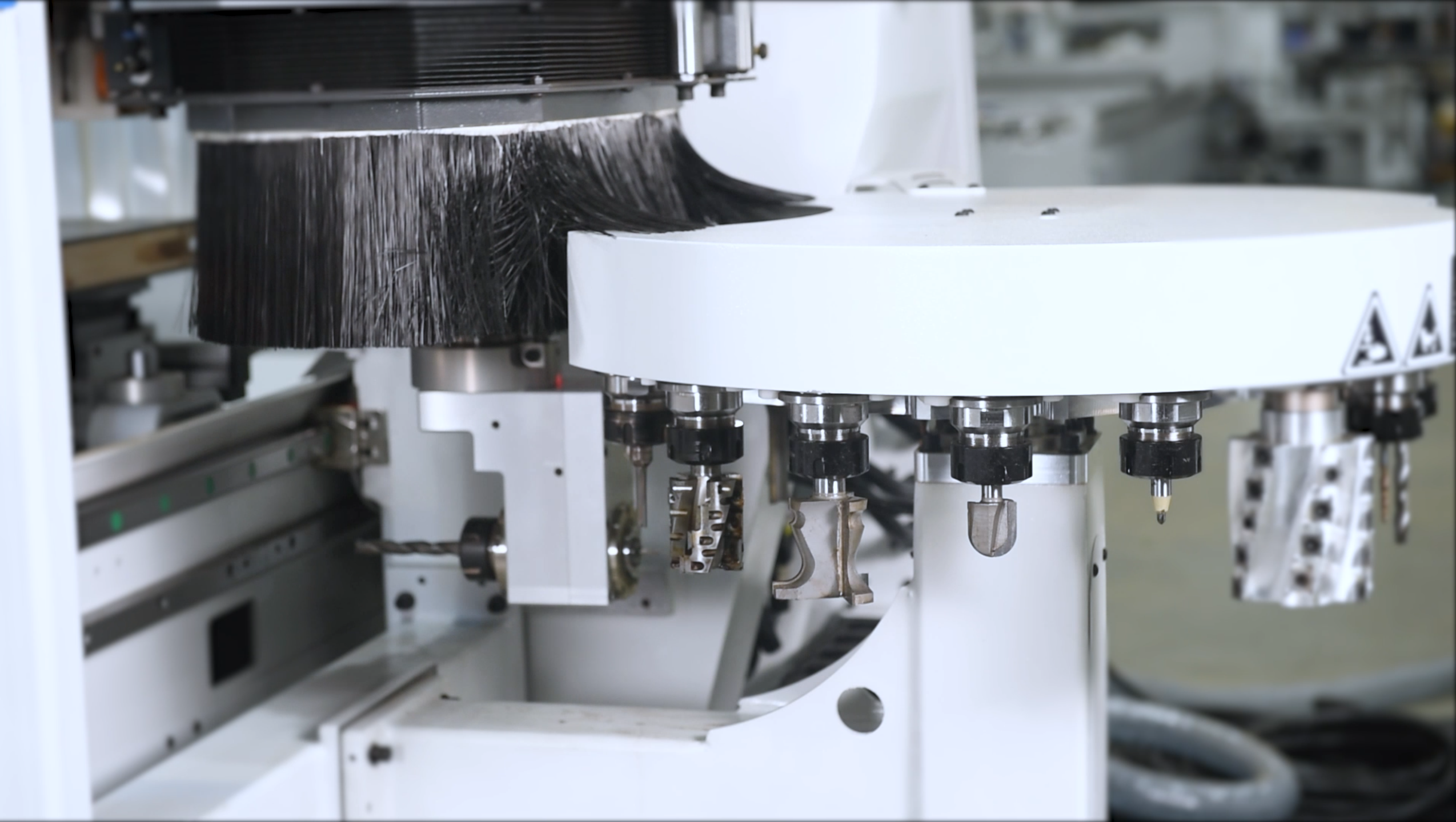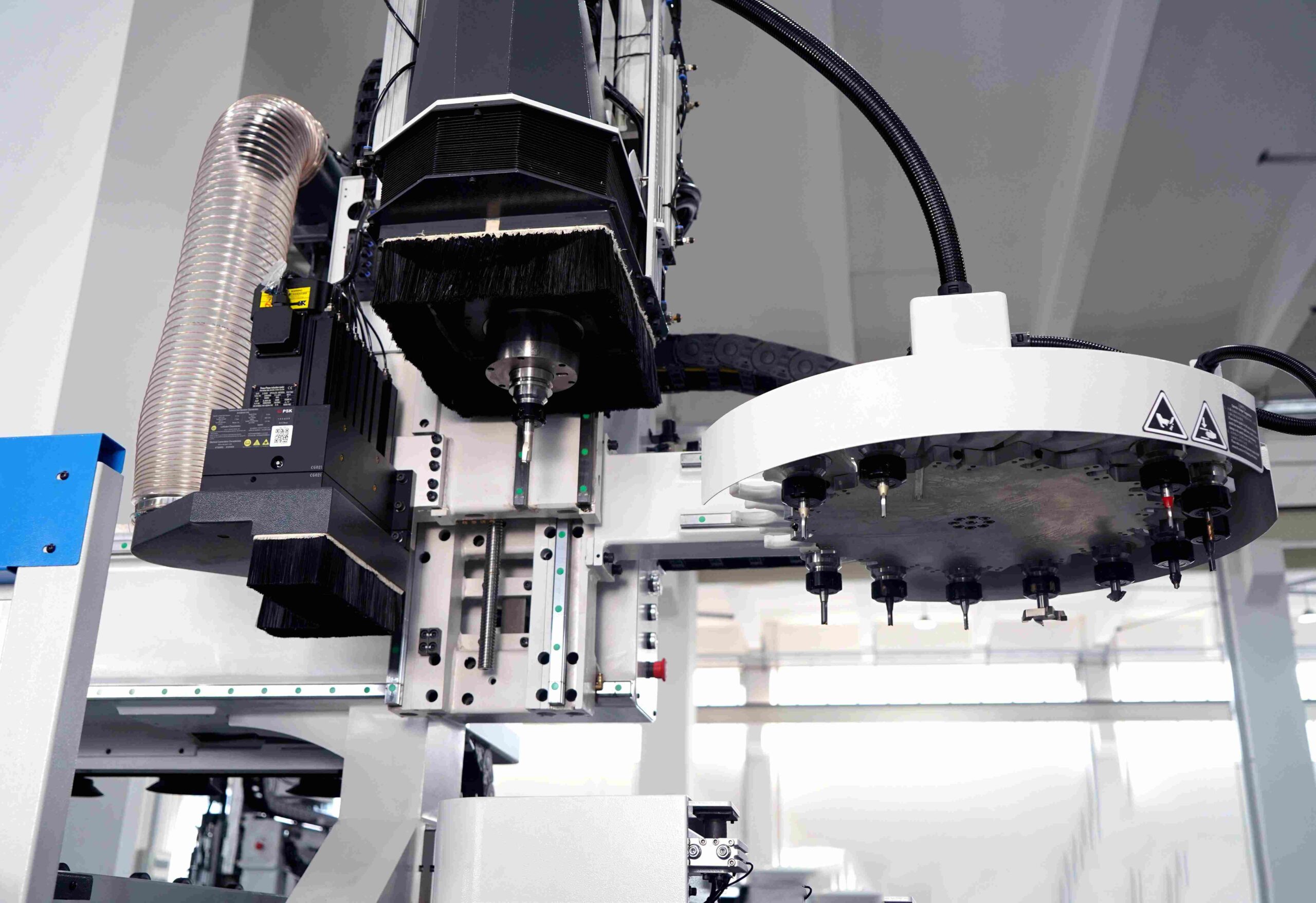 Magazine linear automático com 16 posições para as unidades principais de fresagem, com acoplamento HSK-F63. Movimento on/off com cilindro pneumático. Troca rápida e automática de ferramentas com servo, alta estabilidade e precisão.